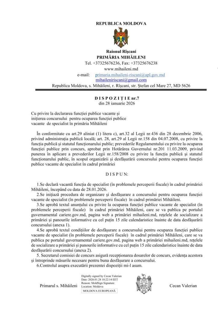 cu privire la ocuparea funcției publice vacante de specialist (în problemele perceperii fiscale) în cadrul primăriei Mihăileni, raionul Rîșcani