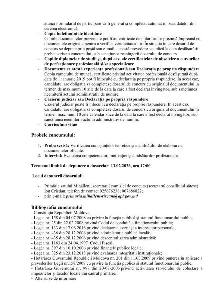 pentru ocuparea funcției publice vacante de specialist (în problemele perceperii fiscale) în cadrul primăriei Mihăileni, raionul Rîșcani