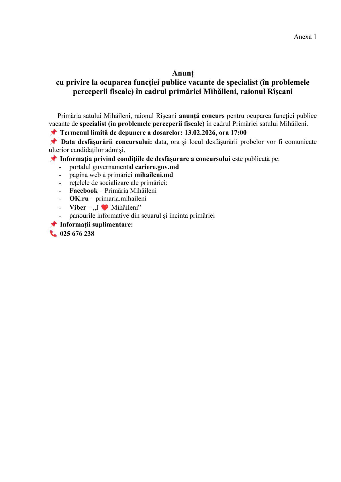 – Primăria satului Mihăileni, secretarul comisiei de concurs (secretarul consiliului sătesc) Ion Cristian, telefon de contact 025676238; 067686822;