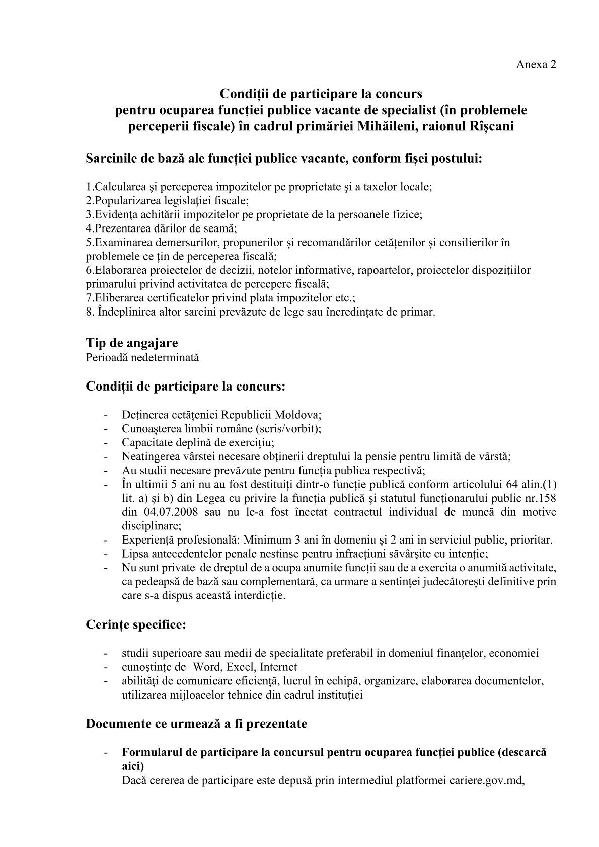 pentru ocuparea funcției publice vacante de specialist (în problemele perceperii fiscale) în cadrul primăriei Mihăileni, raionul Rîșcani